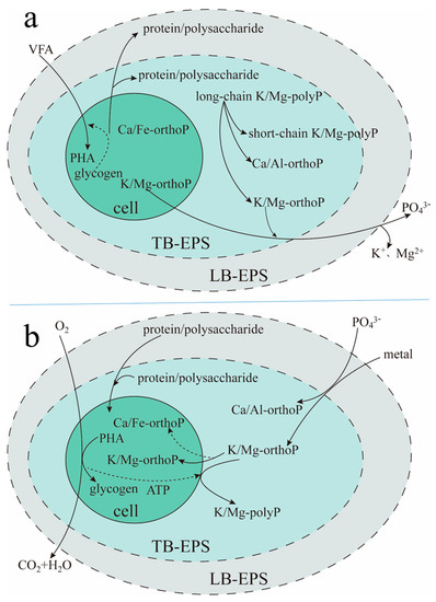 As shown in Figure 8, the biochemical reaction process of TB-EPS phosphate adsorption/complexing in EBPR-activated sludge involved the migration and transformation between metal elements, polyP, proteins, and polysaccharides, which was closely related to anaerobic/aerobic metabolism. At the anaerobic stage (Figure 8a), the microbial cell decomposed intracellular energy substances (mainly intracellular glycogen) and released metabolic secretions into TB-EPS and LB-EPS. In addition, these metabolic secretions were mainly proteins and polysaccharides, in which the protein content was larger than that of polysaccharides. The microbial cells released intracellular K/Mg-orthoP into EPS and the bulk solution. Meanwhile, long-chain K/Mg-polyP in TB-EPS was decomposed into short-chain polyP and orthoP. The abovementioned orthoP accomplished anion exchange with VFAs in the bulk solution, which promoted the transfer of VFAs from the bulk solution into microbial cells to be synthesized into polyhydroxyalkanoates (PHA) with the energy produced by intracellular glycogen. In addition, the orthoP released by the microbial cell and produced by K/Mg-polyP decomposition in TB-EPS were transferred into the bulk solution, with the release of K+ and Mg2+. The above results indicated that the microbial cell (mainly phosphorus-accumulating organisms, PAOs) obtained the competitive advantage of a carbon source.