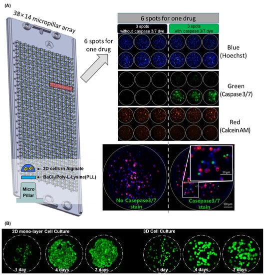 Schematic view of the apoptosis assay chip with live 3D cells. Three-color staining for nucleus (Blue), caspase3/7 (Green), and calcein AM (Red). (A) In a single chip (38 × 14 micropillar array), we tested one drug in one block (1 × 6 micropillar array) and 72 drugs (including two controls) in a 36 × 2 block array. Six spots were used for one drug. Three spots were without the caspase-3/7 staining dye, and the other three spots were with the caspase-3/7 staining dye. (B) 2D and 3D cells grown in the micropillar chip [13].