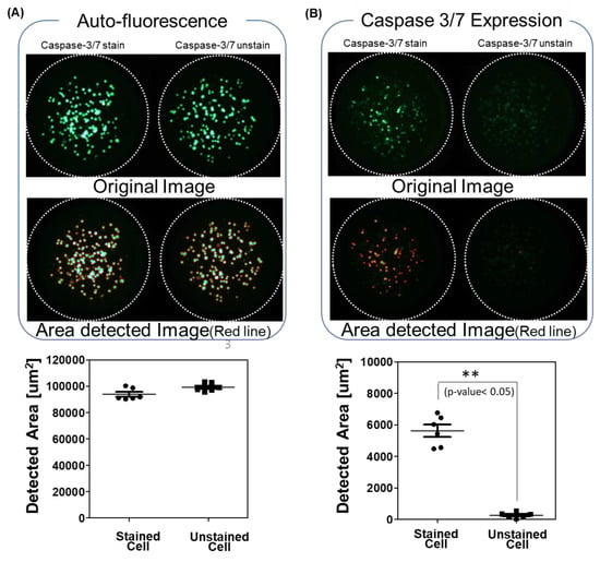 Some cells or drugs emit natural light, and this could overlap with the wavelength range of the dyeing reagent. In the immunostaining, the cells were fixed, and a lot of washing steps removed residual drugs, and a quenching step was also done to reduce the background or autofluorescence. Autofluorescence is a serious problem in color-based analysis in live cells. Drugs inside the cells did not wash out, and the quenching step in the immunostaining was not available for the live cells. Four drugs (Bosutinib, PHA-665752, Sunitinib Malate, and Sotrastaurin) from among the seventy drugs showed green fluorescence in the unstained cells shown in Figure 2A. The green area of the stained and unstained cells with caspase-3/7 looked similar, and the p-value between the two groups is higher than 0.05, which means the two groups are not significantly different (Figure 2A). By comparing staining and unstaining tests for all drugs, we excluded activated caspase-3/7 because of the drugs’ fluorescence.