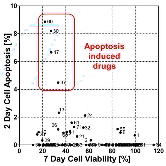 Detection of apoptosis-inducing drugs among the 70 drugs by comparing with activated caspase-3/7 at day 2 and cell viability at day 7. The number around the dot is the drug number in Table 1.
