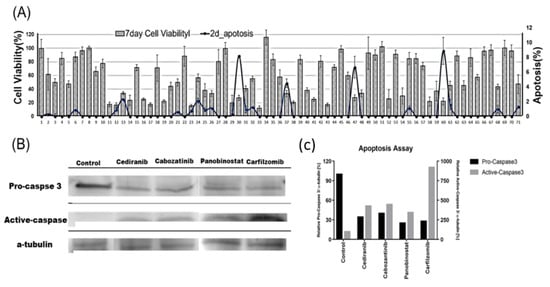 As shown in Figure 2B, the green area was detected in the stained cells but not in the unstained cells. A p-value less than 0.01 between two groups shows that activated caspase-3/7 was significantly overexpressed, and the apoptosis rate was higher (Figure 2B). Before calculating the apoptosis rate, the p-value between the stained and unstained cells were calculated, and any p-values at 0.05 or higher were excluded. Apoptosis is programmed cell death that involves the controlled dismantling of intracellular components while avoiding inflammation and damage to surrounding cells. Generally, apoptosis induction may occur easily when 3D cultured cells are exposed to drugs. After caspase-3/7 was activated, it took time for apoptosis and cell death to occur. Thus, we stained caspase-3/7 at day 2 (one day of drug treatment) and compared those results with the viabilities at day 7 (6 day drug treatment) shown in Figure 4. In the experiment, four drugs showed highly activated caspase-3/7, and all drugs killed 60% or more of the 3D cells. The seven-day cell viabilities of those drugs were lower than 40%, as shown in Figure 3. Figure 4A shows the seven-day viabilities and two-day apoptosis rates according to the seventy drugs. Four drugs (Cediranib, Cabozatinib, Panobinostat, Carfilzomib) showed a high apoptosis rate. To verify the chip data, the activated caspase-3/7 levels of the 3D cells exposed to the four drugs were measured by western blot. However, we have not tested all 71 drugs because it was too many to do western plots for. Thus, four drugs that strongly induced caspase 3/7 were tested. As shown in Figure 4C, the four drugs highly exhibited activated caspase-3 (more than 40%) which was correlated with the measurement of the chips. Thus, we only proved that the chip platform was intended to identify high potency apoptosis-inducing drugs in 3D cultured cells. The highly apoptosis-inducing drugs were already known in previous reports [18,19,20,21]. Cediranib (#30) is a protein tyrosine kinase inhibitor that potently inhibits VEGF receptor-2. It was found to potently inhibit VEGF-A-induced VEGFR-2 phosphorylation and can regulate cell proliferation, apoptosis, invasion, and migration in human umbilical vein endothelial cells and some tumor cells [18]. Cabozantinib (#37) is an oral multikinase inhibitor. The principal targets are receptor tyrosine kinases of cancer cell growth and tumor angiogenesis including MET, RET, AXL, and VEGFR2 [19]. Cabozantinib showed a significant increase in cleaved caspase 3 in sensitive colorectal cancer. Panobinostat (#47) induces apoptosis by production of reactive oxygen species and synergizes with topoisomerase inhibitors in cervical cancer cells [20]. Carfilzomib (#60) induces cell cycle arrest and apoptosis and potentiates the antitumor activity of chemotherapy in rituximab-resistant lymphoma [21].