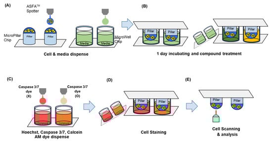 The micropillar chip was made of poly(styrene-co-maleic anhydride) (PS-MA) and contained 532 micropillars (with a 0.75 mm pillar diameter and a 1.5 mm pillar-to-pillar distance) [12]. PS-MA provides a reactive functionality to covalently attach poly-L-lysine (PLL), ultimately attaching alginate spots by their ionic interactions as shown in Figure 1A. Thus, cells in alginate spots on the micropillar did not detach during culturing and changing media. As shown in Figure 1B. cells grew and formed spheroids in alginate spots compared to the flat cell morphology in 2D cell culture. Plastic molding was performed with an injection molder (Sodic Plustech Inc., Schaumburg, IL, USA). Approximately 100 cells (A549 cell line) in 50 nL with 0.5% (w/w) alginate were automatically dispensed onto a micropillar chip with the ASFA™ Spotter ST (Medical & Bio Decision, South Korea). The ASFA™ Spotter ST uses a solenoid valve for dispensing the 50 nL droplets of the cell–alginate mixture and the 1 µL of the media, drugs, or dye reagent. After dispensing the cells and media into the micropillar and microwell, respectively (Figure 5a), the micropillar chip containing the cells in alginate was combined (or “stamped”) with the microwell chip filled with the 1 µL of the fresh media (Figure 5b). The combined chips were incubated for one day at 37 °C and 5% CO2 to stabilize the cells. Then, the micropillar chips were moved to a new microwell chip filed with the drugs for the drug treatment. Two sets of chips were made for apoptosis and viability assays, respectively. Two days after the drug treatment, one of the two microwell chips was prepared with HOECHST (Blue), caspase-3/7(Green), and Calcein AM(Red), as shown in Figure 5c. This microwell chip was combined with the micropillar chip containing the cells for 6 h at room temperature for the staining (Figure 5d). After the staining, micropillar chips were quickly dried at room temperature. The 50 nL alginate spot containing the cells quickly became flat. The cells in the dried alginate spot were easily and quickly visualized with an automatic microscope with a three-color filter without deconvolution technology. (Figure 5e). Six days after the drug treatment, the 3D cultured cells of the other micropillar chip were stained with Calcein AM for the cell viability assay.