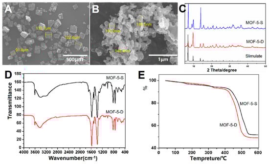 Characterization of MOF-5 synthesized by two methods: (A) Scanning Electron Microscopy (SEM) Image of MOF-5-S; (B) SEM Image of MOF-5-D; (C) X-ray diffraction (XRD) patterns of MOF-5-S and MOF-5-D (D) Fourier Transform Infrared Spectrometer (FTIR) spectra of MOF-5-S and MOF-5-D; (E) Thermogravimetric (TG) analysis of MOF-5-S and MOF-5-D.