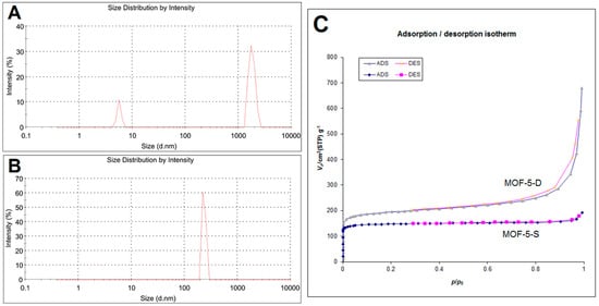 Particle size distribution of MOF-5-S (A) and MOF-5-D (B); (C) Brunauer–Emmett–Teller (BET) isotherm of MOF-5-S and MOF-5-D at 77 K.