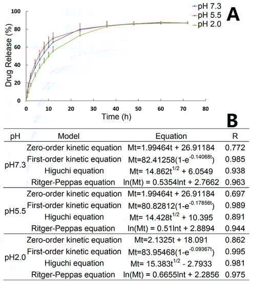 (A) The cumulative release of ORI from ORI@MOF-5 at three pH values; (B) Fitting results of equation.