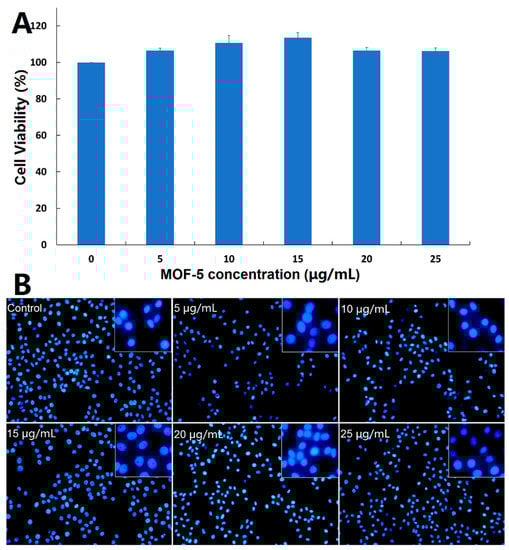 (A) Cytotoxicity study of MOF-5 on HepG2 cells determined by MTT assay; (B) Fluorescent microscopic images of DAPI-stained HepG2 cells following 24-h treatment with different concentrations of MOF-5.