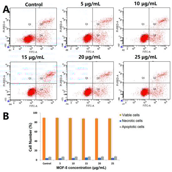 To further verify the cytotoxicity, the Annexin V/PI assay was used to detect the effect of MOF-5 on apoptosis. The results are shown in Figure 9. After being treated with different doses of MOF-5 for 24 h, there is no significant change in the percentage of viable cells, early apoptotic cells, and dead cells. There is no significant induction of apoptosis at the experimental dose, indicating that MOF-5 is biocompatible.