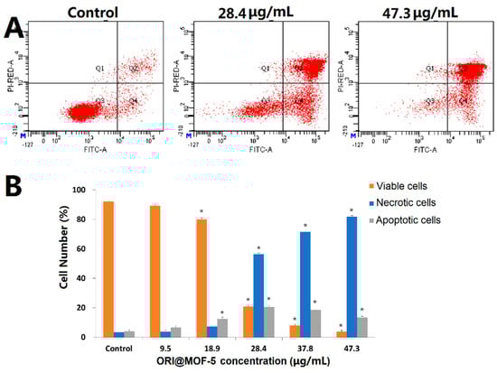 (A) Apoptosis assays for HepG2 cells after treatment with different concentrations of ORI@MOF-5 for 24 h; (B) Statistical analysis of viable, necrotic, and apoptotic HepG2 cells.