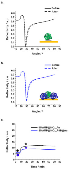 Protein adhesion on surfaces with 2 µm spacing studied by SPR: reflectivity curves of protein adhesion on (a). SMAMP@SiO2_Au and (b). SMAMP@SiO2_PSB@Au. Angular scans before and after exposure to fibrinogen were recorded (solid curves: dry thickness before fibrinogen adsorption, dashed curve: dry thickness after fibrinogen adsorption). (c). SPR kinetics curves of fibrinogen adhesion on SMAMP@SiO2_Au and SMAMP@SiO2_PSB@Au, both with 2 µm spacing. Circles: time points of protein injection; stars: time points of buffer injection.