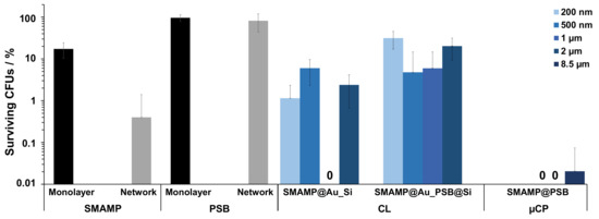 Antimicrobial activity of the different functionalized surfaces against E. coli bacteria. The normalized percentage of surviving bacteria was plotted for unstructured control surfaces (SMAMP monolayer and network; PSB monolayer and network), structured CL surfaces (SMAMP@Au_Si and SMAMP@Au_PSB@Si with 200 nm, 500 nm, 1 µm and 2 µm spacing, respectively), and structured µCP surfaces (SMAMP@PSB with 1 µm, 2 µm, and 8.5 µm spacing, respectively). The data for the monolayer controls and the CL samples with 200 nm, 500 nm and 1 µm spacing are from [46]. The data of the network controls and the structured µCP surfaces are from [47]. The error bars are the standard deviation calculated from at least two independent experiments with five replicates each.