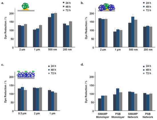 Normalized relative dye reduction (in %) due to keratinocytes grown on the structured and functionalized samples: (a). SMAMP@Au_Si with 200 nm to 2 µm spacing; (b). SMAMP@Au_PSB@Si with 200 nm to 2 µm spacing; (c). SMAMP@PSB samples with 1 µm to 8.5 µm spacing; (d). SMAMP monolayer and PSB monolayer, and SMAMP network and PSB network. The data for each sample was recorded after 24, 48, and 72 h of incubation time, respectively. The error bars are the standard deviation calculated from two independent experiments using three replicates each.