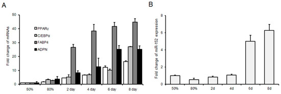 To explore the role of miR-152 in adipogenesis, we used 3T3-L1 cells as the cell model. Firstly, we naturally induced 3T3-L1 cell differentiation. The mRNA levels of audiogenic markers were detected. The result showed that these markers were increased gradually during adipogenesis (Figure 1A). Then, the expression level of miR-152 was detected during 3T3-L1 cell proliferation and differentiation by using qRT-PCR. We found that miR-152 is decreased in confluence from 50% to 80% during proliferation and increased gradually from day two to day eight during differentiation (Figure 1B). These results indicated that miR-152 might play an important role in 3T3-L1 proliferation and differentiation.