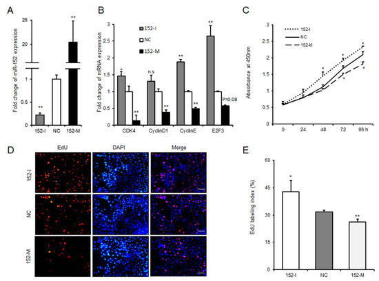 As a first step to investigate whether miR-152 might regulate the proliferation of 3T3-L1 cells, we transfected cells with the miR-152 mimic, the miR-152 inhibitor or the negative control. As shown in Figure 2A, the expression level of miR-152 was significantly increased or decreased compared to the negative group. Cyclin-dependent kinases (such as CDK4), cyclin D1 and cyclin E have been recognized as key regulators of cell growth and proliferation in mammalian cells [19]. Then, qRT-PCR was performed to evaluate the function of miR-152 on the expression of these genes during 3T3-L1 cell proliferation. Results indicated that the knockdown of miR-152 could remarkably increase CDK4 and cyclin E expression; the overexpression of miR-152 significantly suppressed the expression of CDK4, cyclin D1 and cyclin E (Figure 2B). E2F3 belongs to E2Fs transcription factor family, and previous studies from other researchers and ourselves have shown that E2F3 plays a positive role in adipocyte proliferation and is a target of miR-152 [20,21]. qRT-PCR results also showed that altering miR-152 expression could hinder or promote E2F3 expression (Figure 2B). Additionally, to confirm the function of miR-152 on preadipocyte proliferation, a CCK-8 assay was applied. As shown in Figure 2C, after 48 or 72 h transfection, the growth rate of 3T3-L1 cells was significantly increased or repressed in the miR-152 inhibitor and miR-152 mimic groups compared to the control group, respectively. A 5-ethynyl-20-deoxyuridine (EdU) staining analysis also confirmed this finding. The ratio of EdU-positive cells was significantly increased after the knockdown of miR-152, while it was decreased after the transfection of the miR-152 mimic (Figure 2D,E). Therefore, these results suggest that miR-152 could inhibit 3T3-L1 cell proliferation.