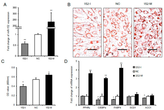 miR-152 promotes 3T3-L1 preadipocyte differentiation. (A) The efficiency of miR-152 overexpression and knockdown during 3T3-L1 cell differentiation. (B) Intracellular lipid accumulation was measured by Oil Red O Staining on day eight after adipogenic induction. (C) The contents of triglycerides in terminally differentiated adipocytes. (D) The mRNA expression levels of PPARγ, C/EBPα, FABP4, SCD1, and ACC1 were detected by qRT-PCR after 3T3-L1 cells transfected with the miR-152 mimic, the miR-152 inhibitor or the negative control on day eight; Results are presented as means ± SD. n = 3. * p < 0.05; ** p < 0.01. Scale = 100 μm.