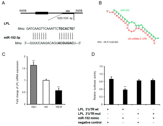 In general, microRNA execute its biological processes through hastening the decay of its target genes by binding to mRNAs’ 3′UTR [22]. To further explore the potential underlying mechanism of how miR-152 regulates adipogenesis, Targetscan was used to predict potential target genes of miR-152. We found that LPL—shown to be important in adipose tissue triglyceride accumulation according to a previous study [23]—is a target of miR-152 Figure 4A. Moreover, the predicted minimum free energy of miR-152 and LPL mRNA 3′UTR was found to be −24.5 kcal/mol by using RNAhybrid [24] (Figure 4B). Next, LPL mRNA levels were detected in 3T3-L1 cells after transfecting the miR-152 mimic, the miR-152 inhibitor or the negative control. qRT-PCR results showed that the transfection of the miR-152 inhibitor significantly increased LPL mRNA expression, and the overexpression of miR-152 showed an opposite effect when compared to the negative control group (Figure 4C). To further validate the inhibitory role of miR-152 on LPL mRNA, we constructed luciferase reporter plasmids containing wild-type (WT) and mutant (MUT) sequences of the LPL 3′UTR region. As seen in Figure 4D, the transfection of the miR-152 mimic significantly suppressed the luciferase activity of plasmids containing the LPL 3′UTR region with miR-152 binding sites, but it did not alter the luciferase activity of plasmids containing the mutant sequence. Collectively, LPL is a bona fide target of miR-152.