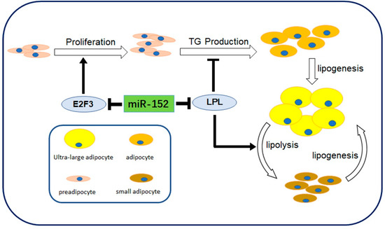 Schematic diagram showing miR-152 roles in 3T3-L1 preadipocyte cells. miR-152 regulates proliferation, triglycerides (TG) production and lipogenesis of small adipocytes by modulating E2F3 and LPL.