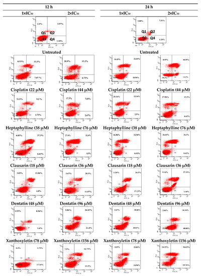 Due to the fact that HepG2 cell line was the most sensitive cell line in responding to the isolated compounds from C. harmandiana, it was thus selected to investigate for the induction of apoptosis and necrosis―the two major modes of cell death. The experiment was performed at two different concentrations at 1 × IC50 and 2 × IC50 for 12 and 24 h as it is important to make sure that two times the IC50 induce nearly 100% death of cells. The flow cytometry histograms of all treated cells and untreated cells are shown in Figure 2.