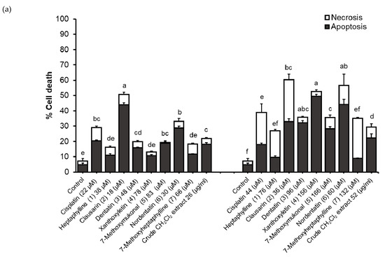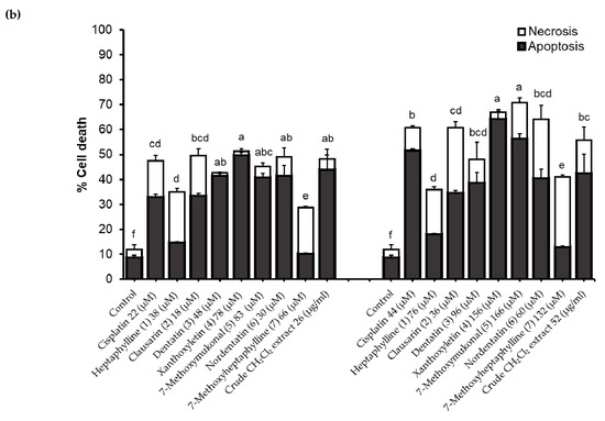 Apoptosis (■) and necrosis (□) death modes induced by the isolated compounds and crude dichloromethane extract from C. harmandiana at 1 × IC50 and 2 × IC50 concentrations against HepG2 cell line at (a) 12 h and (b) 24 h. Control is the untreated cells and cisplatin was used as a positive chemotherapeutic drug. The apoptotic cell percentage in each treatment groups are expressed as the mean ± SD of three experiments and were analyzed by Kruskal Wallis nonparametric statistics. Different lower-case letters indicate a significant difference of apoptosis percentage induced between compounds (p < 0.05).