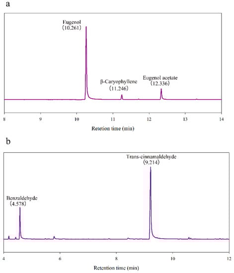 Based on the above results, we selected two best-performing cinnamon and clove oil. The chemical composition of them was analyzed by GC-MS and shown in Figure 2 and Table 2. Analysis results showed that there are three major kinds of compounds in clove oil we used, respectively, eugenol (10.261 min), β-caryophyllene (11.246 min) and eugenol acetate (12.336 min). The contents of benzaldehyde (4.578 min) and trans-cinnamaldehyde (9.214 min) were significantly higher than other components in cinnamon oil we used.
