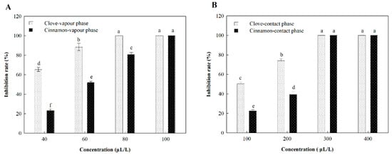 The inhibition activity of cinnamon and clove oil against C. gloeosporioides by (A) fumigation and (B) contact. Note: Different lowercase letters indicate a significant difference at the 5% level.