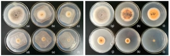 Radial growth of C. gloeosporioides mycelium treated with clove oil at 40 μL/L (b), 60 μL/L (c), 80 μL/L (d), 100 μL/L (e), 120 μL/L (f) compared with the control (a) in vapour phase and 100 μL/L (h), 200 μL/L (i), 300 μL/L (j), 400 μL/L (k), 500 μL/L (l) compared with the control (g) in contact phase after 4 days at 26 °C.