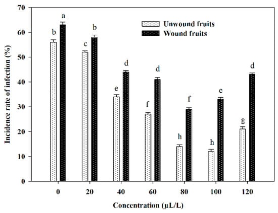 Figure 5 showed an obvious antiseptic effect on inoculated sweet cherry fruits among treatments of essential oil and control, as well as a decreasing trend of rot rate within the concentration range of 20–80 μL/L. However, visible injury of essential oil on sweet cherries emerged at the concentration of 100 μL/L. Additionally, a statistically significant difference was also observed between unwound and wound at the same treated concentration (p < 0.05).