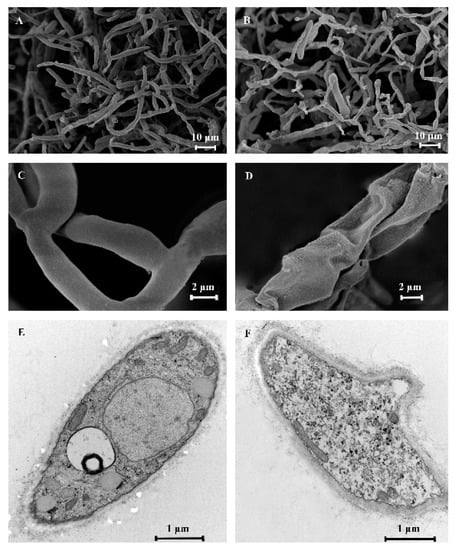 SEM of hyphal morphology (A–D) and TEM of hyphal ultrastructure (E,F) exposed to clove oil. (A,C,E) control, (B,D,F) treated with clove oil contact at 400 μL/L.