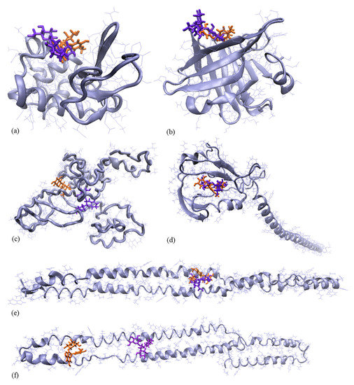Single molecule level details on binding of cyanidin-3-O-glucoside (violet) and peonidin-3-O-glucoside (orange to the α-LA (a), β-LG (b), βCN (c), kCN (d), αS1CN (e), and αS2CN (f). Images were prepared using VMD software. The proteins are represented with ice blue in new cartoon style, while anthocyanins are represented in licorice style.