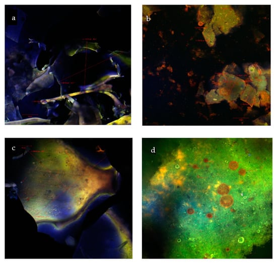 No significant differences between variant 1 and variant 2 were observed, the formations being visualized as fine scales with an autofluorescence in a broad spectral range. For variant 2, it was possible to detect, even in the native variant, some spherical particles formed after the encapsulation, inside of which smaller spherosomes were observed, hence revealing the presence of polyphenolic compounds on the background of a possible double encapsulation process. In Figure 2b, the dyed variant 1 displayed irregularly shaped solsiform formations ranging from 56.79 to 139.32 µm. Within the formations, several spherosomes were identified, with sizes between 4.84 and 16.27 µm, that showed an emission in the red wavelength domain, most likely compounds represented by the black rice anthocyanins. In Figure 2d, in the dyed variant 2, the formed spherosomes presented significantly higher values between 5.39 and 37.91 µm. In both of the fluorophores dyed samples, the presence of anthocyanins was identified, highlighting the fact that the biologically active compounds are protected by the encapsulant matrix.