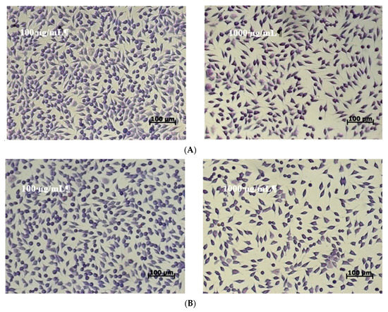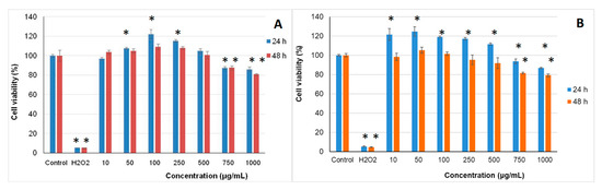 Stock solutions of samples were prepared in culture medium, at a concentration of 1 mg/mL by incubation at 37 °C, for 24 h and then, they were filtered through 0.22-µm membrane filters (Millipore). Trypsinized cells were seeded in 96-well microplates, at a density of 4 × 104 cells/mL and allowed to adhere by incubation at 37 °C, in humidified atmosphere with 5% CO2, for 24 h. Then, the culture medium was replaced with fresh medium containing different concentrations of samples ranging from 10 to 1000 μg/mL. The plates were incubated at 37 °C under standard conditions, for 24 and 48 h, respectively. Cells incubated in culture medium without sample were used as the negative control culture, while cells incubated with 0.003% (v/v) H2O2 served as a positive control.
