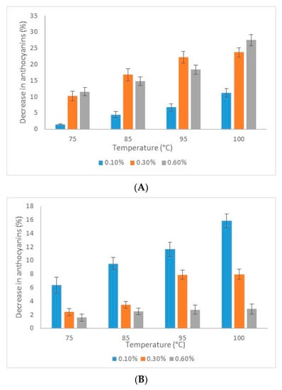 Many studies have been performed on the stability of anthocyanins to heating, usually by treating the anthocyanin-containing solution in a water bath at 100 °C [20]. In the present study, the stability of anthocyanins was tested at different concentrations (0.1–0.6%) at temperatures ranging from 75 to 100 °C for 15 min. The effect of thermal treatment on the anthocyanins content in both variants are shown in Figure 5.