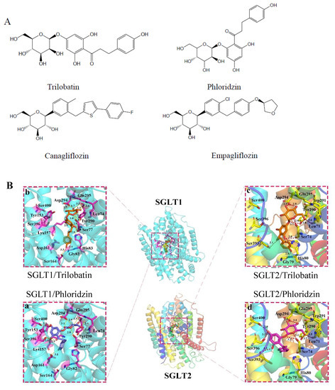 The results of molecular docking. (A) The structure of trilobatin, phloridzin, canagliflozin, empagliflozin. (B) The interaction between the indicated inhibitors and Na+-d-glucose co-transporter (SGLT)1/2.