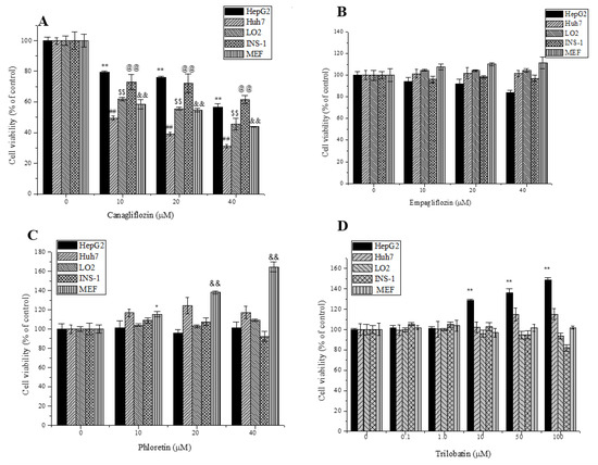 Effects of trilobatin, canagliflozin, empagliflozin and phloridzin on the proliferation of HepG2, Huh 7, LO2, INS-1, and MEF cell lines. After the cells were incubated with indicated concentrations of canagliflozin (A), empagliflozin (B), phloridzin (C), trilobatin (D) for 24 h, viable cell number was evaluated by MTT assay, Data are means ± SD (n = 12), * p < 0.05, @@, ##, ** and &&, p < 0.01 vs. control.