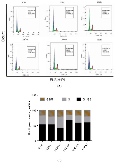 Cell cycle analysis was performed with flow cytometry. Generally, after HepG2 cells were treated with indicated concentrations of trilobatin for 24 h, the cells were trypsinizated and washed twice with phosphate-buffered saline (PBS), and then fixed with methanol. The cells were collected by centrifugation, and resuspended in propidium iodide staining solution (50 μg/mL propidium iodide, 0.05% Triton X-100, 18 μg/mL EDTA and 100 U/mL RNase A in PBS). After incubation for 30 min at room temperature, DNA content was determined by quantitative flow cytometry (Beckman, Coulter, Inc., Middlebury, IN, USA).
