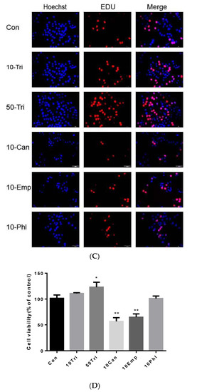 Assessment of DNA replication is also an important approach for identifying and quantifying the effect of compounds on cell proliferation [15,16], and 5-ethynyl-2′-deoxyuridine (EDU) had been taken as a powerful tool by incorporating into cellular DNA during DNA replication and accumulating in the nucleus to determine cell cycle kinetics and to disclose potential mitogenic, cytostatic, and cytotoxic effects upon specific cell treatment [17,18,19]. As shown in Figure 3C,D, treatment with 50 μM trilobatin for 24 h induced a significant increase of HepG2 cell proliferation with raising the ratio of EDU-positive cells (p < 0.05), but at the same time point, treatment with canagliflozin and empagliflozin markedly inhibited the proliferation of HepG2 cells (p < 0.01).