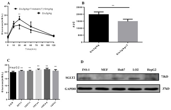 Trilobatin suppressed the intake of glucose in vivo and in vitro. (A) After 3 mg/kg glucose was intragastric administrated with or without 10 mg/kg trilobatin, blood glucose was measured at 0, 15, 30, 60 and 120 min. (A) the contents of blood glucose at 0, 15, 30, 60 and 120 min, Data are means ± SD (n = 8), **p < 0.01 vs. control. (B) The area under curve (AUC) of Figure 3A. (C) After HepG2 cells were replaced onto 24-well plate and cultured overnight, the cells were washed once with phosphate-buffered saline (PBS) and starved 2 h, and then the media was changed with high glucose (25 mM) completed media, and continued to incubate for 2 h, the supernatant was collected to determine the content of glucose according to the protocol from supplier. Data are means ± SD (n = 12), **p < 0.01 vs. control. (D) The protein levels of SGLT2 in INS-1, MEF, Huh7, LO2 and HepG2 cells.