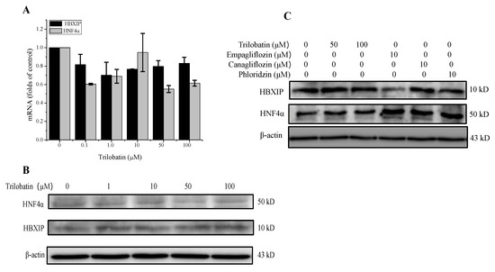 It has been reported that Hepatitis B X-interacting protein (HBXIP) and hepatocyte nuclear factor (HNF)-4α were the two-key regulator of hepatocyte proliferation [20,21,22]. In this study, we firstly determined the effect of trilobatin on the expression of HBXIP and HNF4α. The results from RT-PCR and western blot indicated that trilobatin had no significant role on the mRNA and protein of HBXIP and HNF4α (Figure 5A,B).