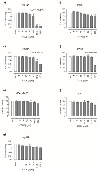 In particular, the results showed that CSDE at concentrations of 30, 55, and 100 µg/mL reduced the viability (IC50 = 35.78 ± 0.029) of DU 145 cells by 20, 87, and 89%, respectively (Figure 1a). At the same concentrations, CSDE diminished the viability of PC-3 cells by 14.9, 22.8, and 23%, respectively (Figure 1b). Furthermore, CSDE at concentrations of 55.5 and 100 µg/mL also diminished the viability (IC50 = 54.88 ± 0.026) of LNCaP cells by 29% and 51%, respectively (Figure 1c). No cytotoxic effect on the viability of PNT2 cells was observed, except at 100 µg/mL where cell viability diminished by 58% (Figure 1d). As far as breast cancer cells are concerned, the extract did not affect the viability of MDA-MB-231 cells (Figure 1e) while CSDE, at the concentration of 100 µg/mL, reduced the viability of MCF-7 cells by 27% (Figure 1f). CSDE, at any concentration tested, did not affect the viability of Hep G2 cells (Figure 1g).