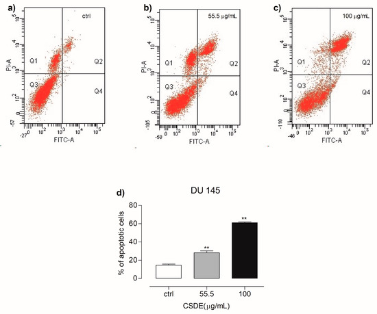 Since DU 145 cells were found to be the cells with higher sensitivity to CSDE treatment with respect to other cell lines tested, we decided to evaluate whether the reduced cell viability was correlated to apoptosis processes. To this end, we carried out flow cytometry analysis by using Annexin V/PI apoptosis assay. As depicted in Figure 2, the treatment with 55.5 or 100 μg/mL of CSDE for 24 h led to a significant increase in late apoptosis rate, corresponding to 28.2% and 61% respectively, compared to untreated cells at 14.1%. (Figure 2a–d). In Figure 2d, we reported the percentage of cells in late apoptotic phase.