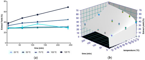 In general, the yield of extraction was not statistically different (p > 0.05, one factor ANOVA) for any temperature and time defined in the 25 to 75 °C range, suggesting that at these temperatures, only the washing phase is visible for extractions up to 4 h. The diffusion phase is responsible for significant extraction at 100 and 120 °C, whose yields increased with increasing extraction time (p < 0.05). Although the results at 2 h/25 °C were statistically different from other extracts obtained at the same temperature, this was considered an experimental error, as the expected kinetics is an increasing yield for longer times for all temperatures, as observed for the other temperatures (Figure 1a).