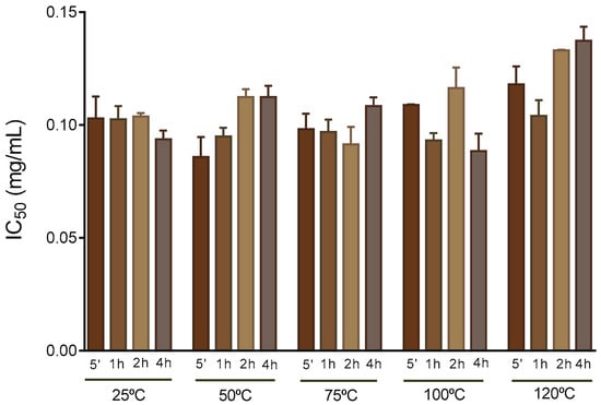 The extracts showed no significant differences (p > 0.05) regarding the ability to scavenge the ABTS radical (IC50 values of 0.088–0.134 mg/mL), though the average value at 120 °C was slightly higher (slightly lower antioxidant activity). This last tendency is consistent with the lowering of pholorotannins in the extract (Figure S1), suggesting that pholorotannins are key players in the antioxidant properties of the extracts. In fact, the direct correlation between the concentration of phlorotannins and antioxidant activity has been previously reported by distinct authors, including Liu and Gu, when working with several extracts from F. vesiculosus [45]. Nevertheless, one must note that several other compounds present in F. vesiculosus have also been attributed to have antioxidant activity, such as fucoidans and carotenoids [11], which can explain the almost reduced variation in the ABTS•+ scavenging ability for the time and temperatures tested once, at higher temperatures, higher amounts of fucoidans were extracted that could have a positive influence in the IC50 of the samples.