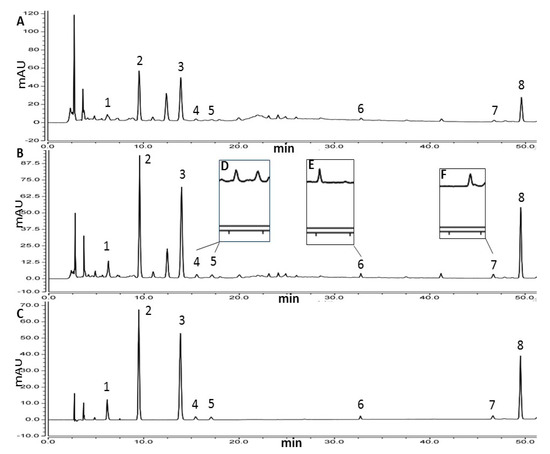 High performance liquid chromatogram of Viticis Fructus, extracted by UAE directly with the eluent of MSDP (A), extracted by B/Z-MMSPD (B), mixture of standard compounds (C), double magnification of peak 4, 5 (D), 6 (E), 7 (F). Peaks: 1, protocatechuic acid; 2, p-hydroxybenzoic acid; 3, agnuside; 4, 10-O-vanilloylaucubin; 5, vanillin; 6, luteolin; 7, 5,3′-Dihydroxy-6,7,4′-trimethoxyflavanone; 8, casticin.