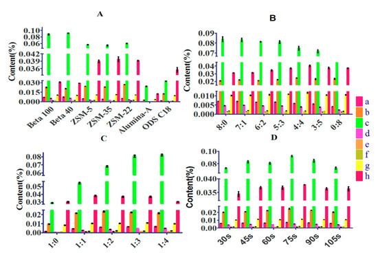 Effects of parameters on efficiency of 8 contents: a, protocatechuic acid; b, p-hydroxybenzoic acid; c, agnuside; d, 10-O-vanilloylaucubin; e, vanillin; f, luteolin; g, 5,3′-Dihydroxy-6,7,4′-trimethoxyflavanone; h, casticin. (A) Types of the sorbent. (B) Ratios of Beta to ZSM-22. (C) Ratios of sample to sorbent. (D) Grinding time.