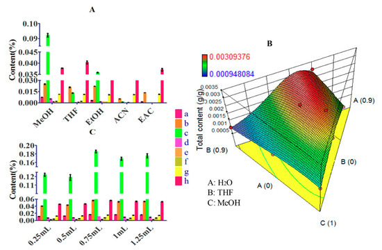 Effects of parameters on efficiency of 8 contents: a, protocatechuic acid; b, p-hydroxybenzoic acid; c, agnuside; d, 10-O-vanilloylaucubin; e, vanillin; f, luteolin; g, 5,3′-Dihydroxy-6,7,4′-trimethoxyflavanone; h, casticin. (A) Eluent type. (B) Concentration of elution optimized by Optimal (custom) Design of Mixture (Design-Expert 10.0.7). (C) Volume of eluent.