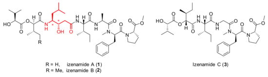 Recently, three new depsipeptides, namely, izenamides A (1), B (2), and C (3), were isolated from the marine cyanobacterium 1605-5 by Suenaga and coworkers (Figure 1) [25]. Interestingly, izenamides A (1) and B (2) were shown to inhibit cathepsin D in vitro. These two depsipeptides consist of seven monomers, including four amino acids, two hydroxy acids, and a γ-amino-β-hydroxy acid called statine. Izenamide C (3), which lacks a statine moiety and possesses a glycine unit instead of the alanine seen in izenamides A (1) and B (2), has no inhibitory activity against cathepsin D. The absolute configuration of the statine moiety in izenamide B (2) was indirectly determined by numerous efforts by Suenaga and coworkers [25].
