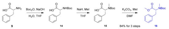 The synthesis of izenamides commenced with synthesizing tetrapeptides 4 and 5. Initially, NMe-d-Phe 16 was prepared from commercially available d-Phe (9) as shown in Scheme 2. Amine protection of d-Phe 9 with Boc anhydride and N-methylation of resulting carbamate 14 afforded acid 15, which was esterified to produce desired monomer 16 in 84% yield over three steps.