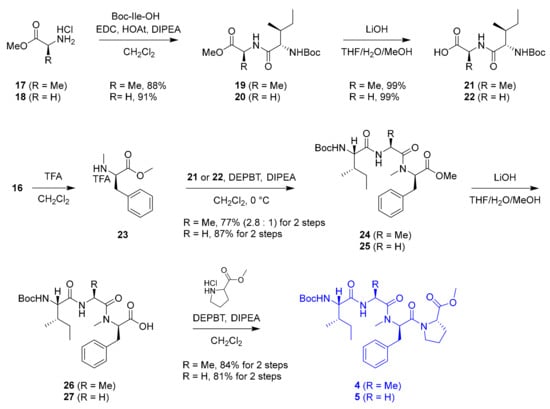 With monomer 16 in hand, we turned our attention to the synthesis of tetrapeptides 4 and 5 (Scheme 3). To avoid facile DKP formation upon sequential elongation from the C-terminal NMe-Phe and Pro residue, we synthesized tetrapeptides 4 and 5 according to the optimized sequence of fragment couplings. Amidation of l-alanine methyl ester hydrochloride (17) and glycine methyl ester hydrochloride (18) with Boc-Ile-OH followed by ester hydrolysis with LiOH afforded dipeptides 21 and 22 in high yields. Deprotection of 16 and coupling of resulting free amine 23 with acids 21 and 22 produced tripeptides 24 and 25 in 77 and 87% yields over two steps, respectively. Unfortunately, epimerization was observed during the amidation to form 24. After thorough optimization of the coupling conditions, amidation in the presence of DEPBT in CH2Cl2 at 0 °C provided the best results in terms of high chemical yield and minimal epimerization (2.8:1). Tripeptides 24 and 25 were subjected to hydrolysis and then amidation with l-proline methyl ester hydrochloride to afford tetrapeptides 4 and 5 in 84 and 81% yield over two steps, respectively. In general, the N-Me peptide backbone near the C-terminal is prone to α-epimerization upon carboxy activation due to steric hindrance and electronic effects [28]. However, we could obtain the desired tetrapeptides without epimerization under the optimized conditions (DEPBT, CH2Cl2, 0 °C).