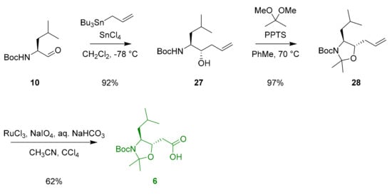 Optically pure statine 6 was prepared by the known procedure [26,27] (Scheme 4). An elegant highly diastereoselective allyl addition to N-Boc-l-leucinal in the presence of SnCl4 [26] provided desired threo isomer 27. The reaction of homoallylic alcohol 27 with 2,2-dimethoxypropane in the presence of catalytic PPTS followed by RuO4-mediated oxidative degradation [27] afforded monomer acid 6.
