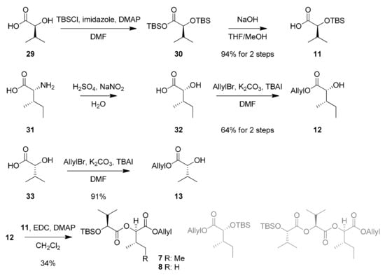 The synthesis of esters 7 and 8, which are the C-terminal fragments of izenamides, began with the preparation of silyl-protected valic acid 11 (Scheme 5). Global TBS-protection of commercially available l-valic acid (29) and hydrolysis of resulting silyl ester 30 produced C-terminal acid 11 in 94% yield over 2 steps. d-Allo-isoleucic acid 32 [29], which was prepared through the diazotization of commercially available d-allo-Ile (31), and d-valic acid (33) were converted to corresponding allyl esters 12 (64% for 2 steps) and 13 (91%), respectively. The EDC-mediated esterification of acid 11 with alcohol 12 afforded ester 7. Unfortunately, a satisfactory yield for this esterification was not achieved due the production of undesired esters by inevitable silyl transfer between hydroxyl groups.