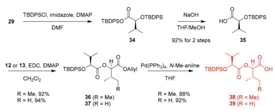 Therefore, we decided to change the TBS protecting group to a bulkier TBDPS group, which was anticipated to minimize silyl transfer (Scheme 6). To our delight, the silyl transfer was minimized in the coupling reactions, and fragments 36 and 37 were obtained in 92% and 94% yields, respectively. Finally, allyl deprotection of esters 36 and 37 with N-Me-aniline in the presence of Pd(0) produced acids 38 in 88% and 39 in 92% yield, respectively.